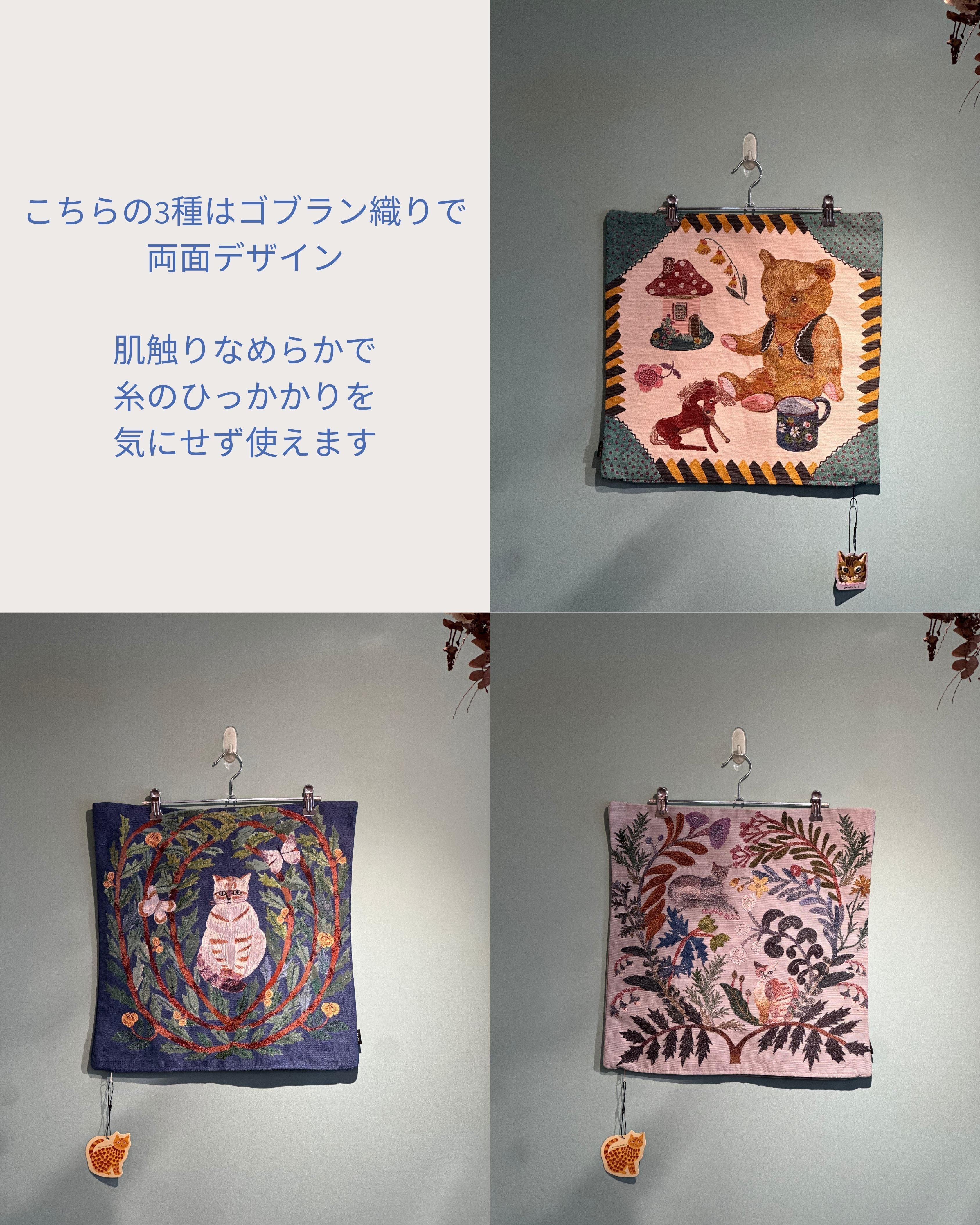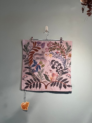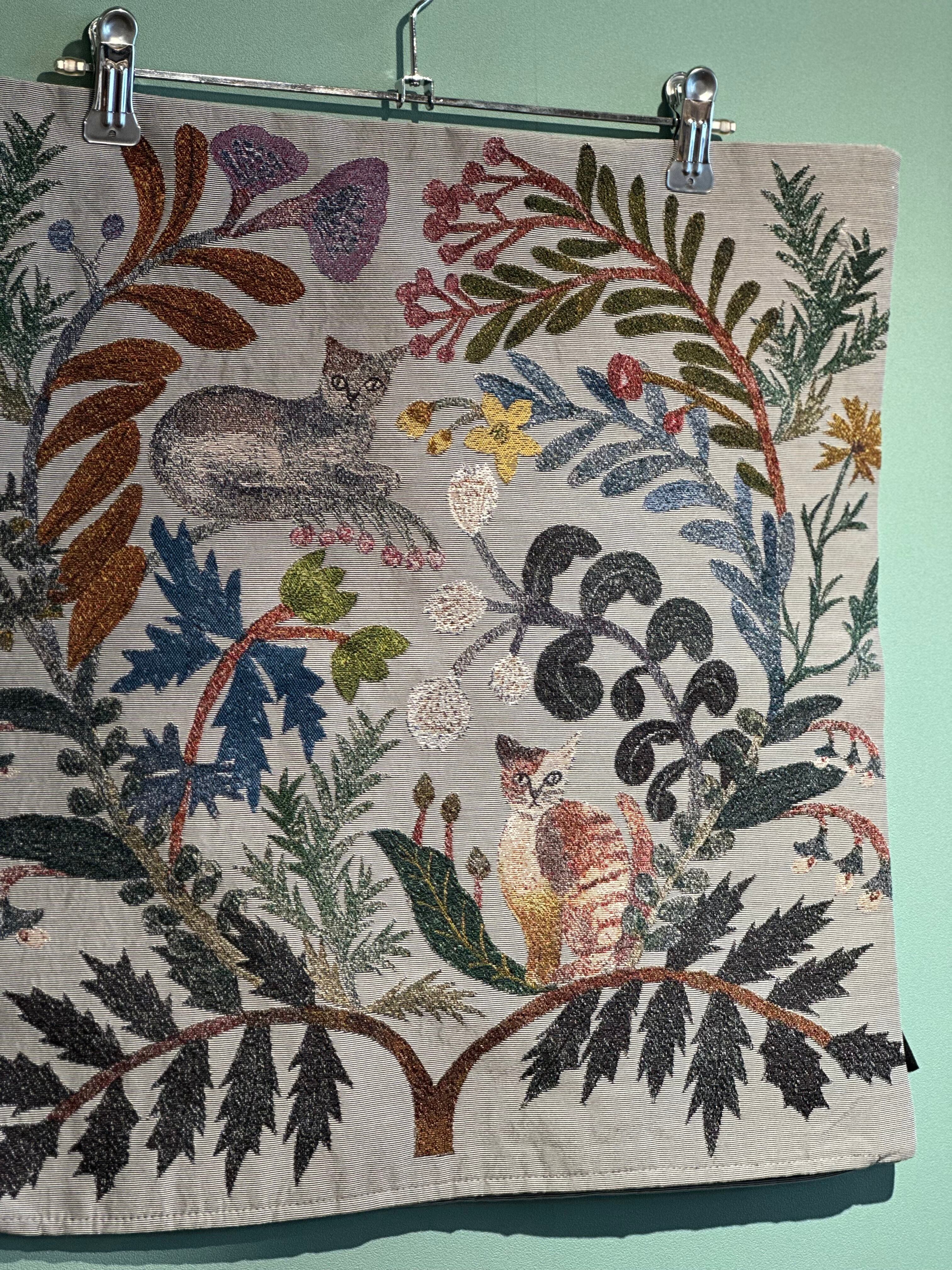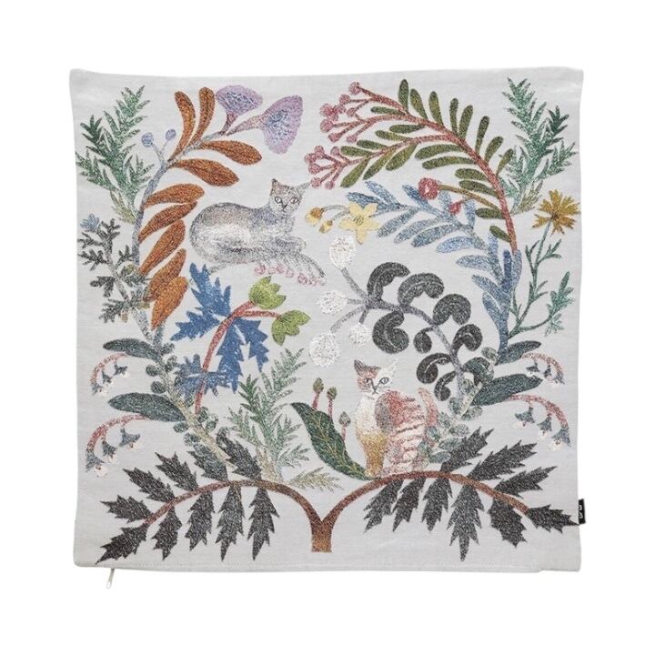 クラシカルな風合いが魅力のゴブラン織りに、松尾ミユキさんらしい、植物と動物の切り絵モチーフが映えるクッションカバーです。