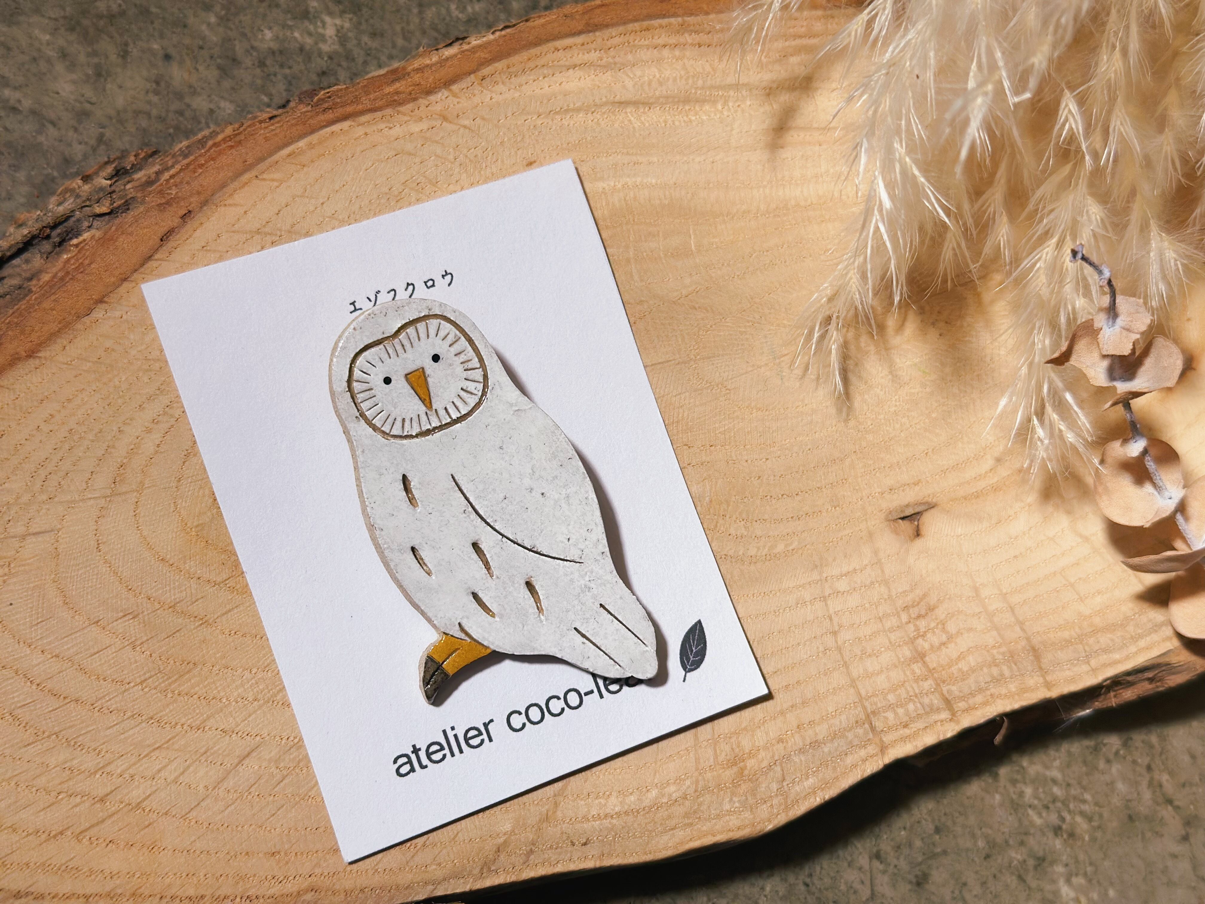 手作りの陶土のブローチ、北海道らしいエゾフクロウデザインです!