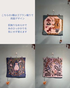 動物や草花、どこか懐かしくてユーモラスなモチーフが、繊細な織りで立体感のある表情に仕上がっています。