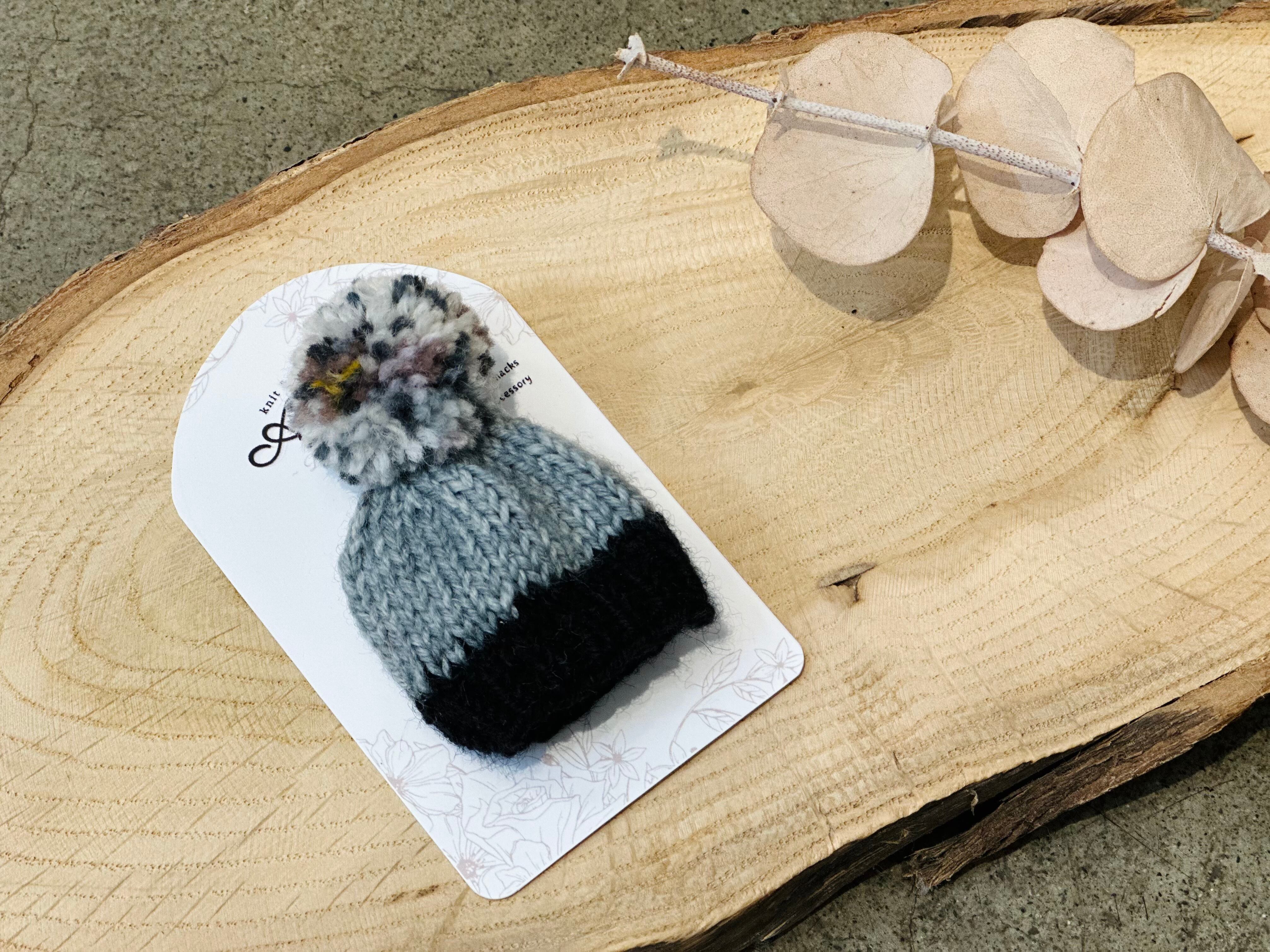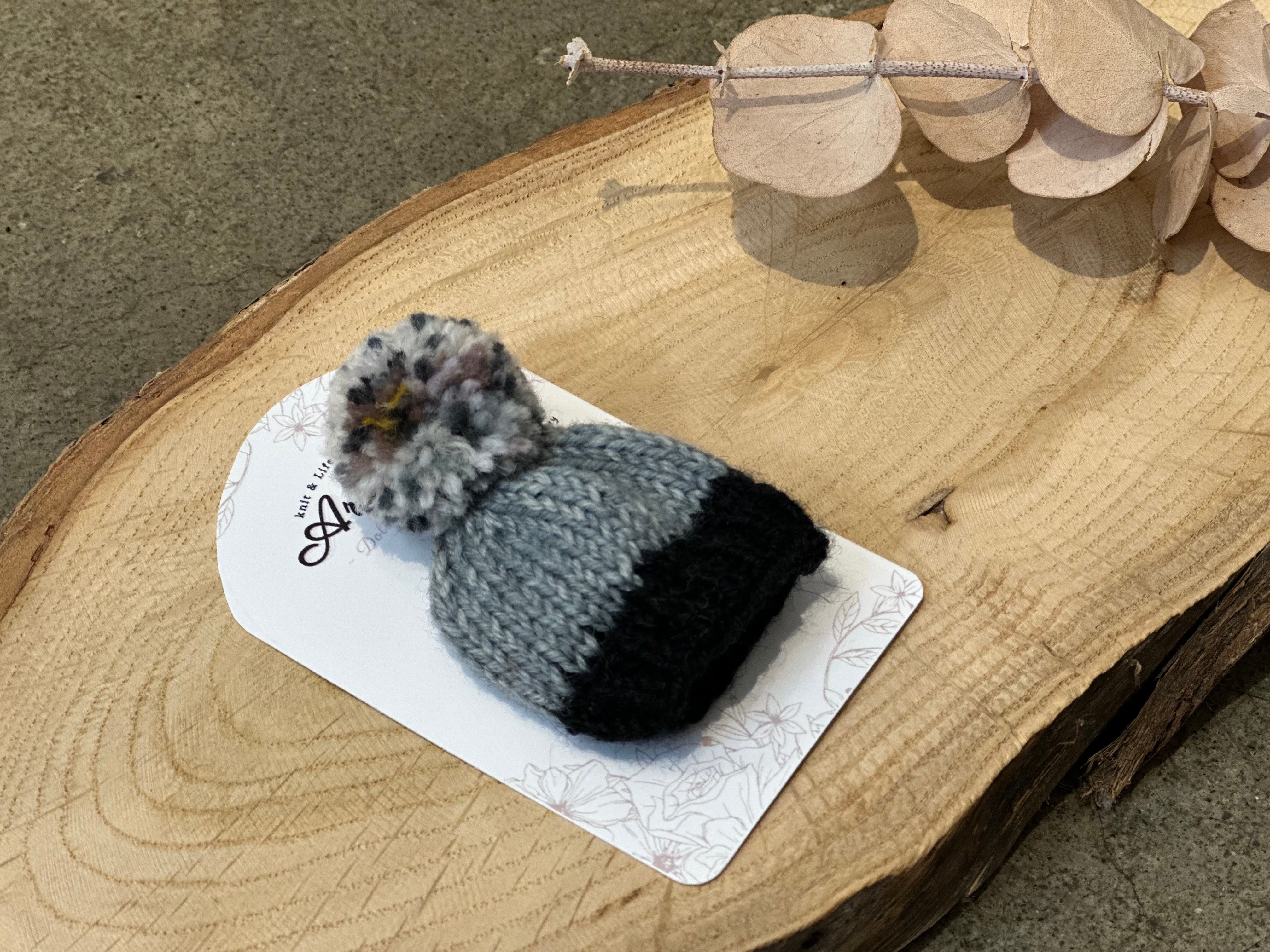 手編みの温もりを感じる、ポンポン帽子デザインのブローチ