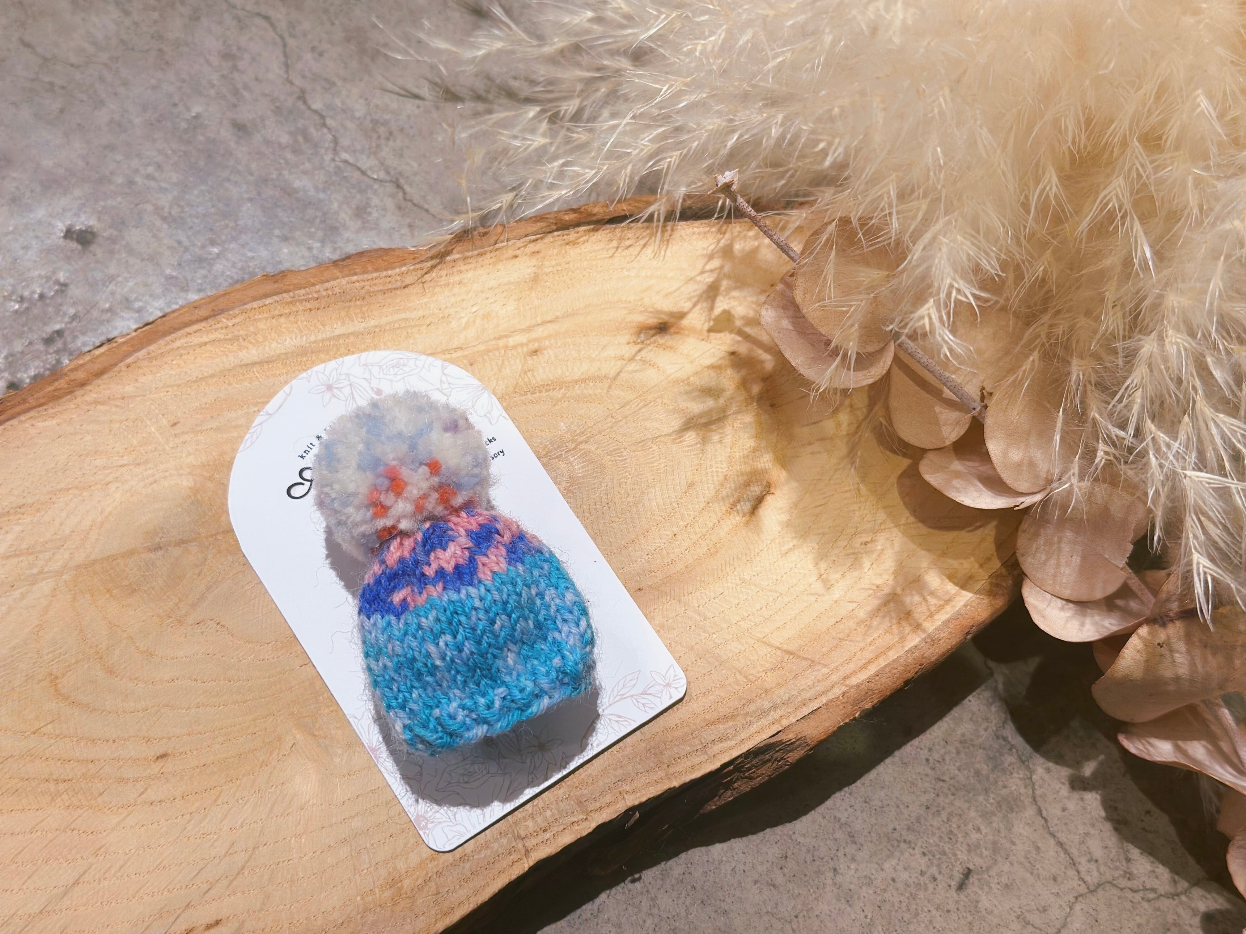 手編みの温もりを感じる、ポンポン帽子デザインのブローチ